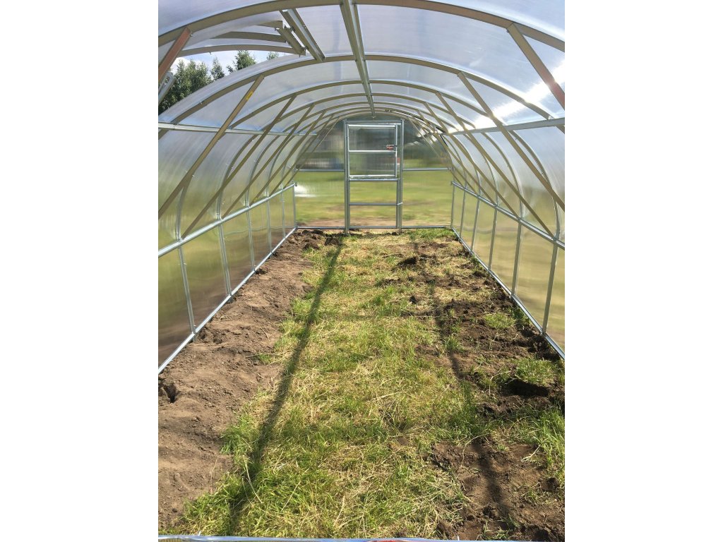 pozinkovaný ocelový profil 1mm, rozteč oblouků 67 cm, dvojité dveře vpředu, ventilační okno vzadu, prosklení nutno vyřezat z dodaných polykarbonátových desek, ocelová pozinkovaná základna, možnost montáže střešního okna - ano, originální těsnění pro zahradní skleníky (po obvodě předního a zadního čela) |