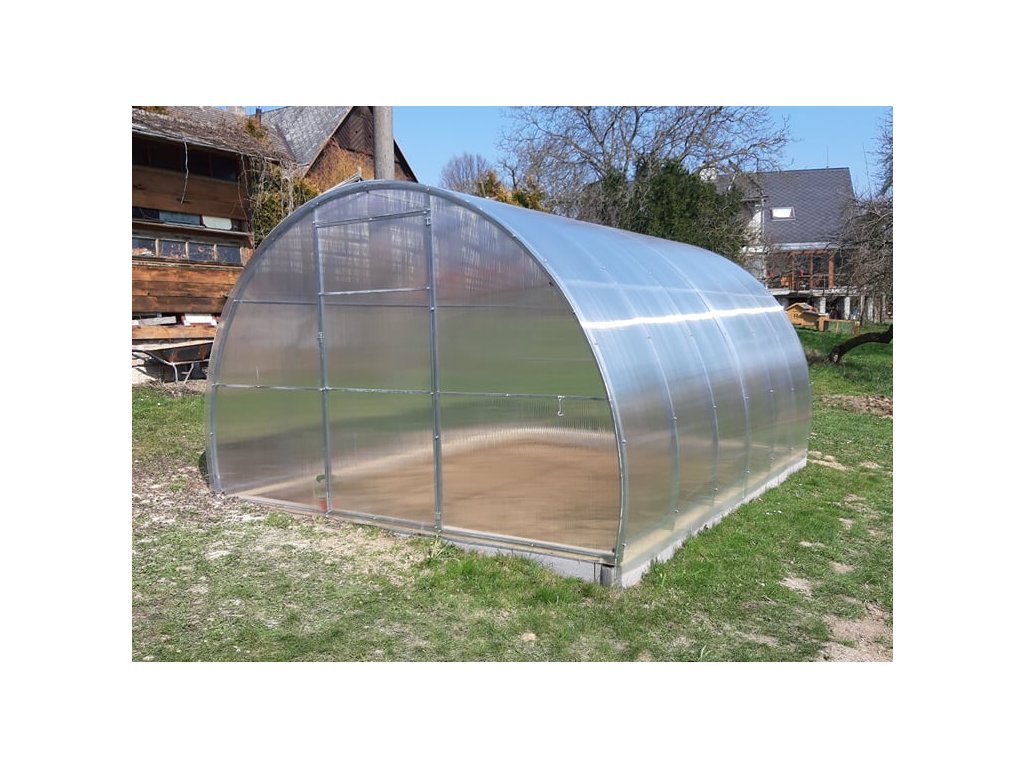 Robustní konstrukce, 100% spolehlivost a jednoduchá montáž . Skleník je určen nejen do vyšší poloh, kde přes zimu zůstává ležet trvale sníh, ale i do nížin pro zákazníky, kteří chtějí mít klidné spaní i při nejistém počasí dnešní doby. Skleník má zvýšenou hustotu nosných oblouků na pouhých 67 cm od sebe . Nosné oblouky jsou vyrobeny z galvanicky pozinkované ocelové obdélníkové trubky průřezu 40 x 20 mm a síle stěny 0,85 - 1,05 mm a jsou vyrobeny z jednoho kusu. Přední i zadní čelo jsou každé svařené v jeden kompletní celek, čímž se rapidně zvýšila pevnost a únosnost celé konstrukce. Plastový polykarbonátový plášť je z britského polykarbonátu.