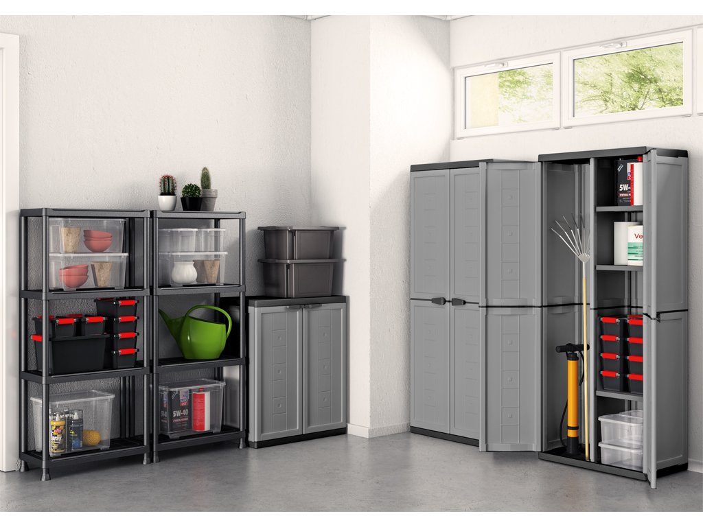 Skříň Keter Jolly Utility přináší promyšlenou kombinaci klasického policového systému a otevřeného prostoru pro větší nářadí nebo třeba smeták. Díky nízké hmotnosti 9,57 kg ji snadno přemístíte, přitom však zůstává stabilní a pevná. Výškově nastavitelné police umožní přizpůsobit si vnitřní uspořádání přesně podle potřeby. Uzamykatelný systém zvyšuje bezpečnost uložených věcí, a skříň tak skvěle poslouží nejen v domácím provozu, ale i na chalupě nebo v technickém zázemí.