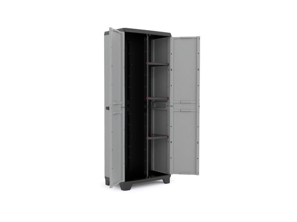 Keter Stilo Utility se skvěle hodí do každého prostoru, kde je potřeba kombinovat klasické policové uspořádání s otevřeným prostorem pro delší náčiní. Pravá část skříně obsahuje tři nastavitelné police s nosností 10 kg, zatímco levá část poskytuje dostatek místa například na košťata, kbelíky nebo hadice.