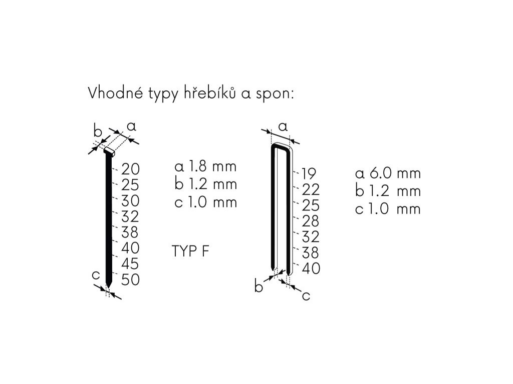 - spony 19 mm 5,7x1,2x1 mm, 30 mm 5,7x1,2x1 mm, 40 mm 5,7x1,2x1 mm, hřebíky typ F - 40 mm, hlava 2 mm / 1,25x0,95 mm, typ F - 30 mm, hlava 2 mm / 1,25x0,95 mm, typ F - 50 mm, hlava 2 mm / 1,25x0,95 mm