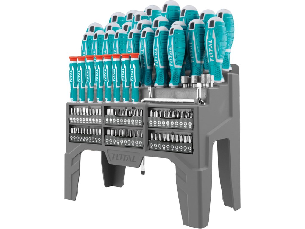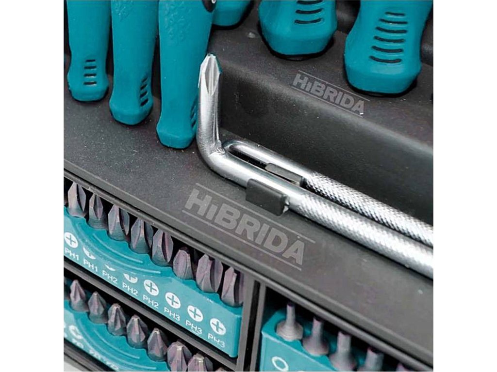 8ks plochých šroubováků: SL3x75, SL4x100, SL5x75, SL5x100, SL5x125, SL6x100, SL6x150, SL8x1508ks křížových šroubováků: PH0x75, PH0x100, PH1x75, PH1x100, PH1x150, PH2x100, PH2x150, PH3x1503ks Torx šroubováků: T10x100x3, T15x100x3.5, T20x100x43ks Pozidriv šroubováků: PZ0x100, PZ1x100, PZ2x1001ks Magnetická stopka šroubováku: 7x1001ks Škrabací šídlo: 3x758ks hodinářský šroubovák: SL1.5x50, SL2.5x50, PH000x50, PH00x50, PH0x50, T6x50, T8x50, T10x5060ks bitů šroubováků:2ks SL3, 2ks SL4, 3ks SL5, 3ks SL6, 2ks SL7, 2ks PH0, 3ks PH1, 3ks PH2, 2ks PH3, 2ks PZ0, 3ks PZ0, 3ks ZZ3ks 1,5, 1ks H2, 1ks H2.