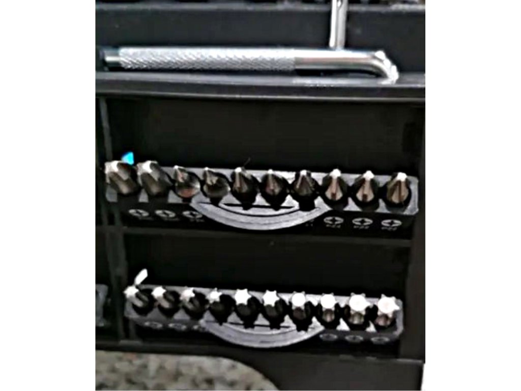 5, 1ks H3, 2ks H4, 1ks H5, 1ks H5.5, 2ks H6, 2ks T8, 2ks T9, 2ks T10, 2ks T15, 2ks T20, 2ks T20, 2ks T3s05, 2ks T3s05 02ks dvoucestný šroubovák ve tvaru Z: SL5xPH1, SL6xPH26ks 1/4" napájecích objímek: 5 mm, 6 mm, 7 mm, 8 mm, 9 mm, 10 mmS 1 ks plastovým rámečkem