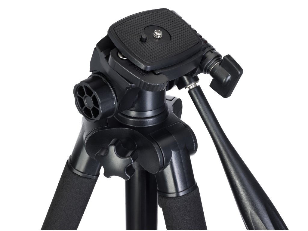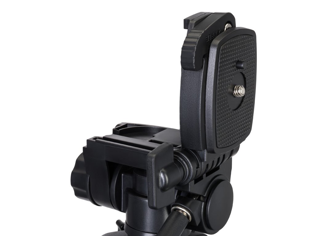 Hlava se otáčí o 360° horizontálně kolem své osy a naklání se dopředu a dozadu, zatímco zámek se může naklápět do stran až o 90°, což vám umožní najít ideální úhel pro vaše zařízení. Středový sloupek stativu lze navíc volitelně použít jako monopod. Rychloupínací destička usnadňuje nastavení a výměnu zařízení na stativu.