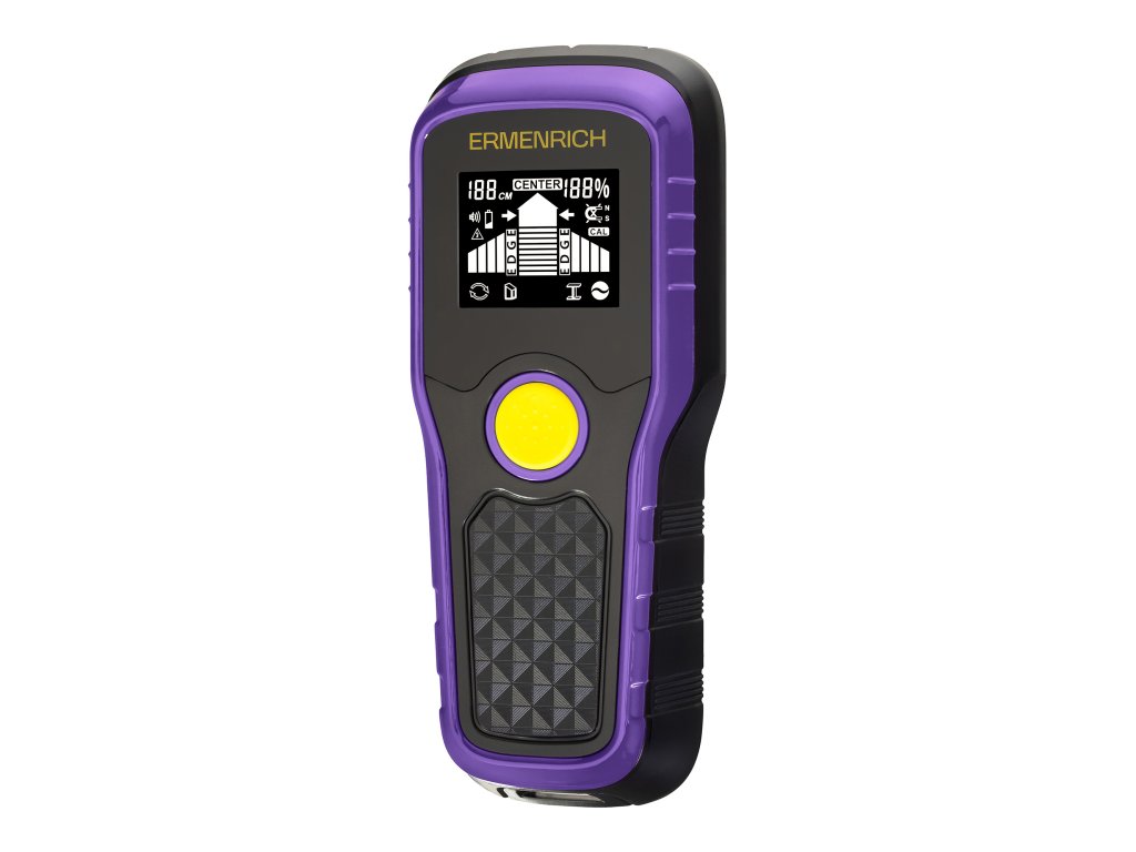 Ermenrich Ping SM40 je multifunkční detektor skrytých prvků, který je navržen pro dlouhou životnost při stavebních, rekonstrukčních a instalačních pracích. Odolné tělo, které je vyrobeno z nárazuvzdorného a otěruvzdorného ABS plastu, má tři režimy skenování (svorníky, kovy a vodiče pod napětím). Přístroj automaticky zvolí optimální režim detekce podle nejsilnějšího signálu a rychle se přizpůsobuje různým úkolům.