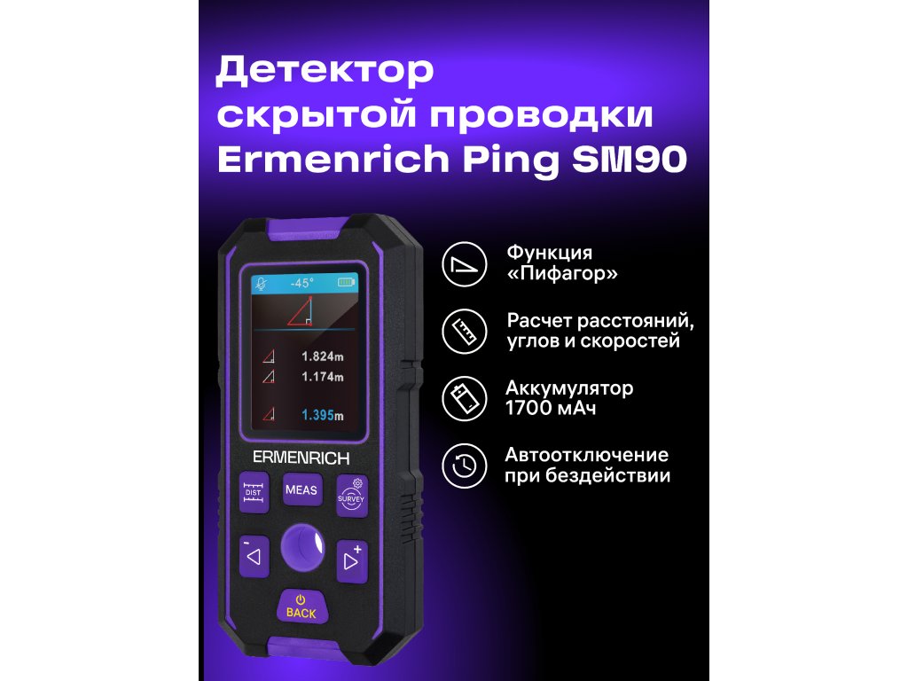 Ermenrich Ping SM90 je zařízení 3 v 1, které kombinuje funkce stavebního detektoru, laserového svinovacího metru a digitální vodováhy. Díky tomu je multifunkčním nástrojem pro rekonstrukce bytů, stavební práce, instalaci zařízení a dokončování stěn. Jednoduché ovládání usnadňuje používání přístroje v domácnosti. Široká škála funkcí vyřeší úkoly profesionálních řemeslníků a stavebníků.