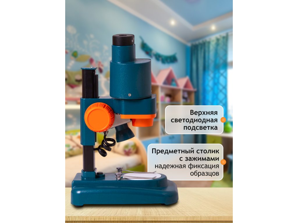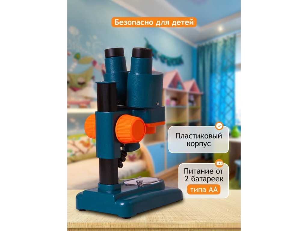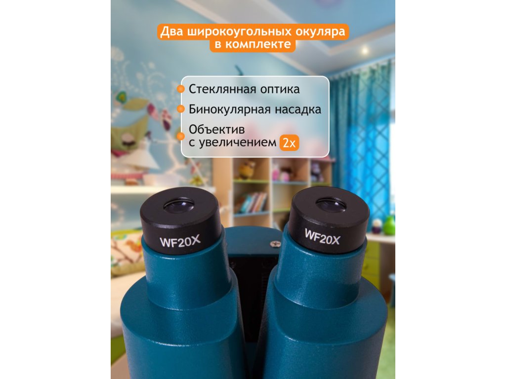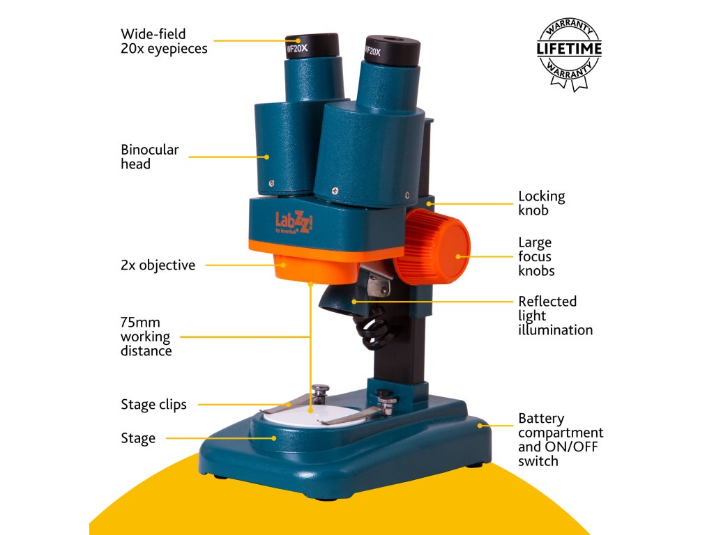Binokulární hlavice umožňuje pozorování objektů oběma očima – tím jim ulevíte a dlouhodobý výzkum bude pohodlnější. Světelné diody umístěné nad pracovním stolkem rovnoměrně osvětlují pozorovaný vzorek. Stolek má kovové spony, které pevně drží připravený preparát. Čočka objektivu poskytuje zvětšení 2x a s dodávaným příslušenstvím budete moci dosáhnout zvětšení až 40x. Dva širokoúhlé okuláry umožňují studovat i větší objekty.