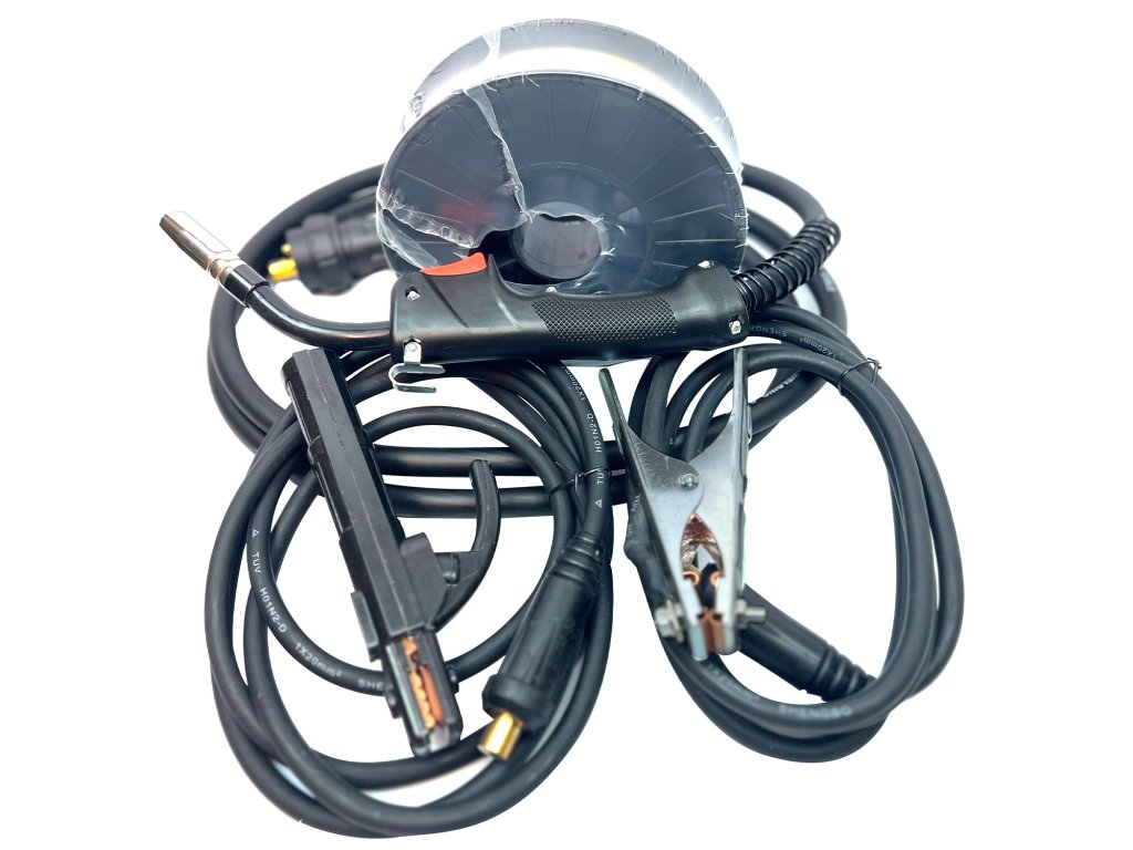 Součástí dodávky je svařovací drát 0,8mm (5 kg buben), MIG hořák s kabelem, svářečský štít, kabel s držákem elektrod, kabel se zemnícími kleštěmi a drátěný kartáč kombinovaný s kladivem na strusku.