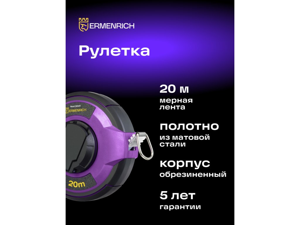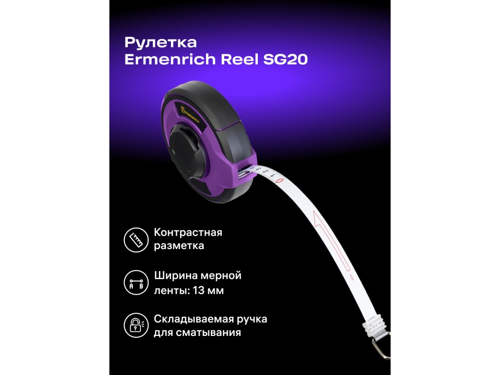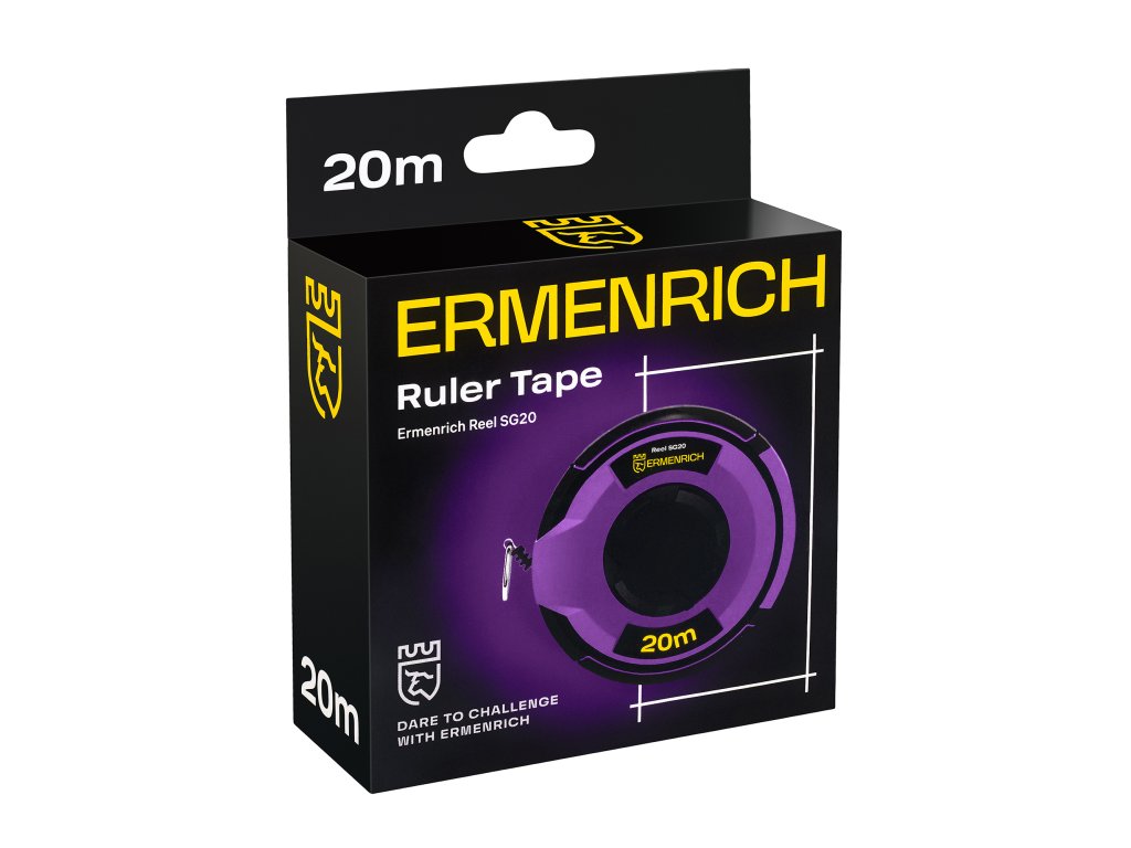 Model Ermenrich Reel SG20 je vyroben z nárazuvzdorného ABS plastu a přídavné vložky z termoplastické pryže TPR zlepšují úchop. Svinovací metr má boční otočnou kličku, která umožňuje jeho svinutí. Tato sklopná klička zajistí, že vám svinovací metr nebude při používání překážet.