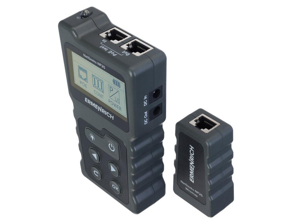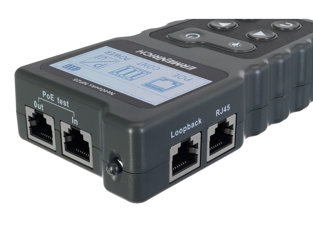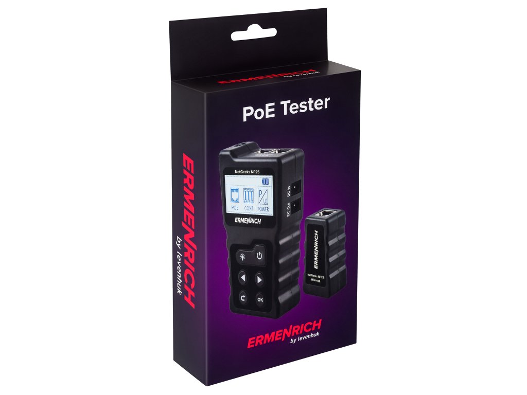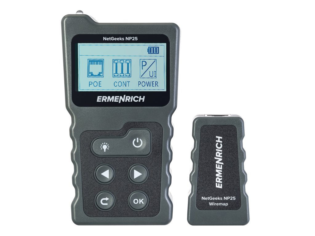 Přístroj Ermenrich NetGeeks NP25 je tester kabelů PoE pro sítě napájené PoE (Power over Ethernet). Používá se pro nastavení IP telefonie, nasazení IP dohledových systémů, připojení bezdrátových přístupových bodů atd. Přístroj Ermenrich NetGeeks NP25 podporuje všechny typy zařízení PoE. Dokáže zkontrolovat provozuschopnost kabelů, určit typ PSE, identifikovat střední a koncové rozpětí a měřit výkon a napětí.