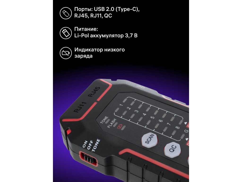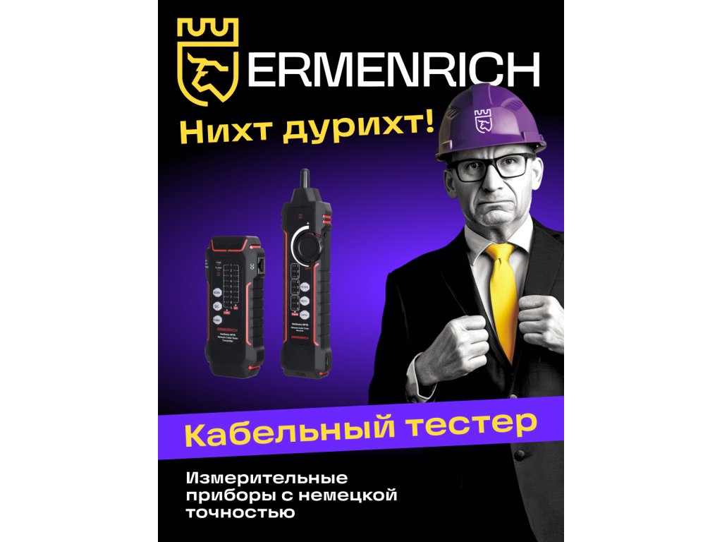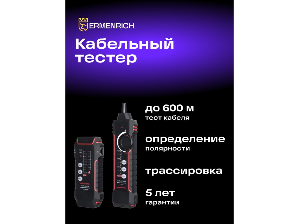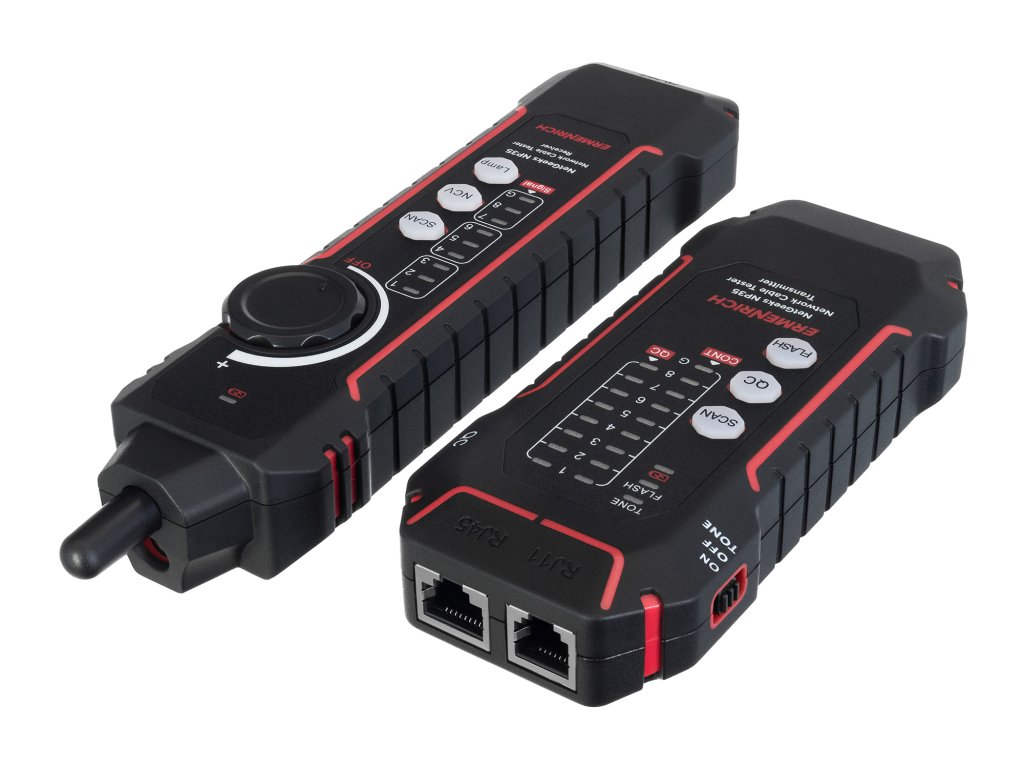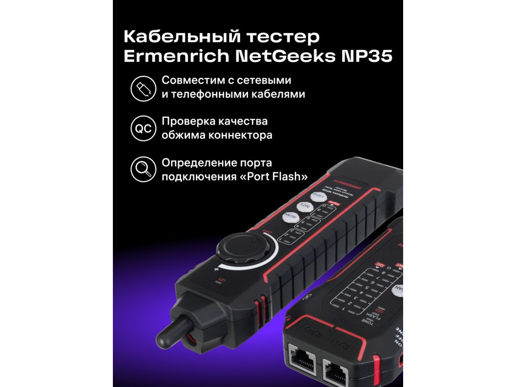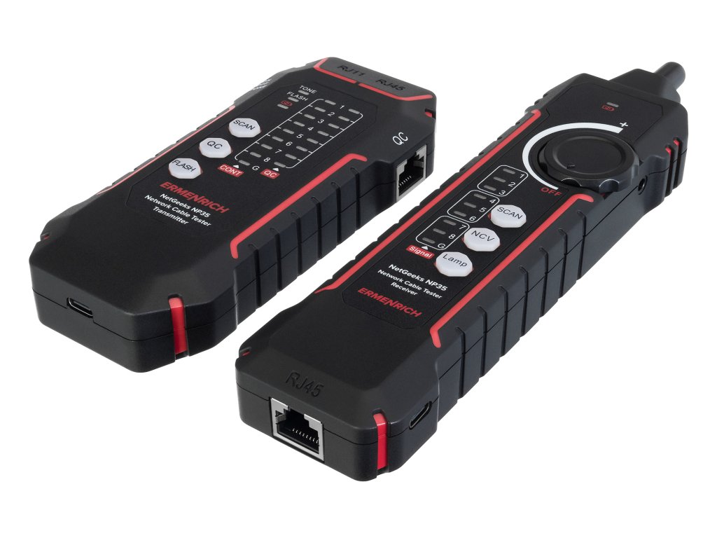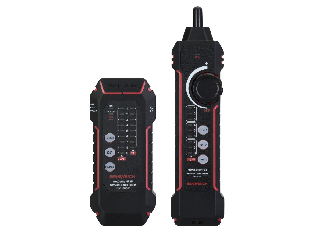 Tester Ermenrich NetGeeks NP35 je určen k testování a sledování kabelů. Umožňuje identifikovat chyby při instalaci nebo poruchy v síťových a slaboproudých systémech: zkraty, přerušené obvody, zkřížené dvojlinky. Funkce Port Flash dokáže rychle identifikovat síťový port, ke kterému je testovaná tabulka připojena. K dispozici jsou i další funkce: kontrola kvality krystalové hlavy kabelu a test stavu telefonní linky.