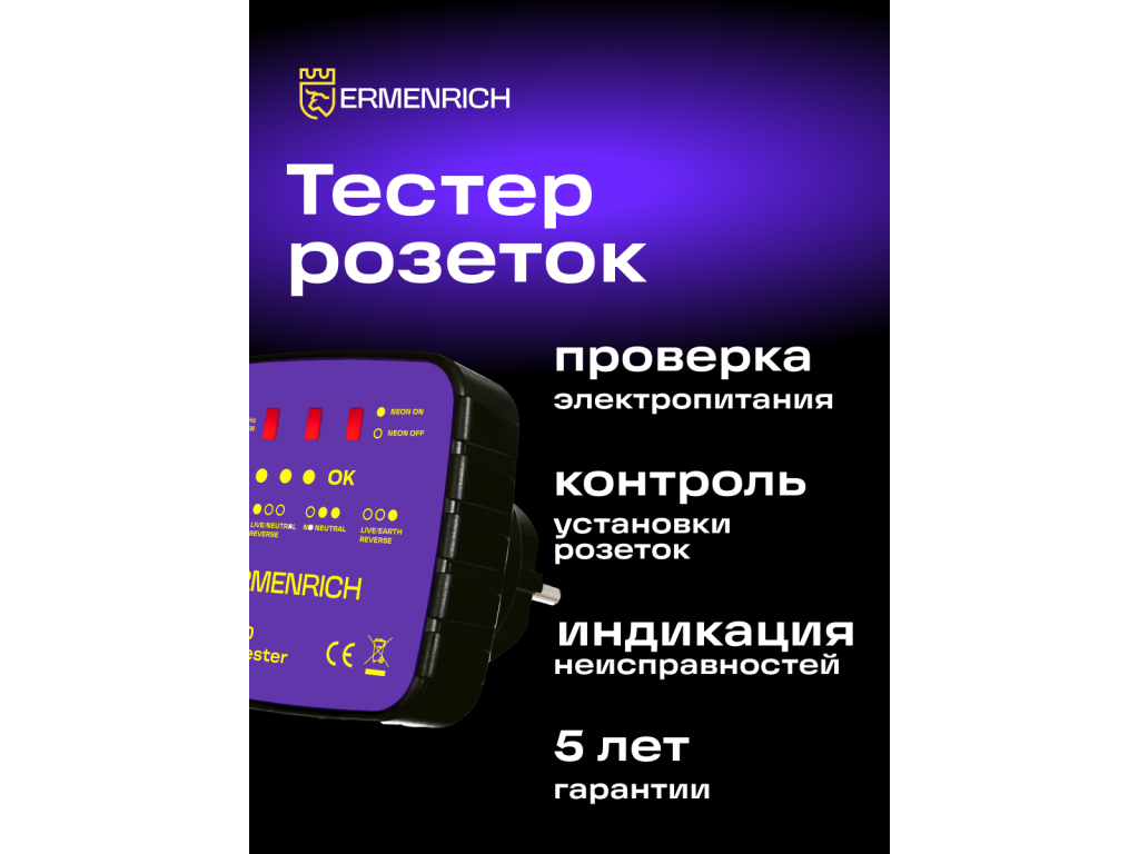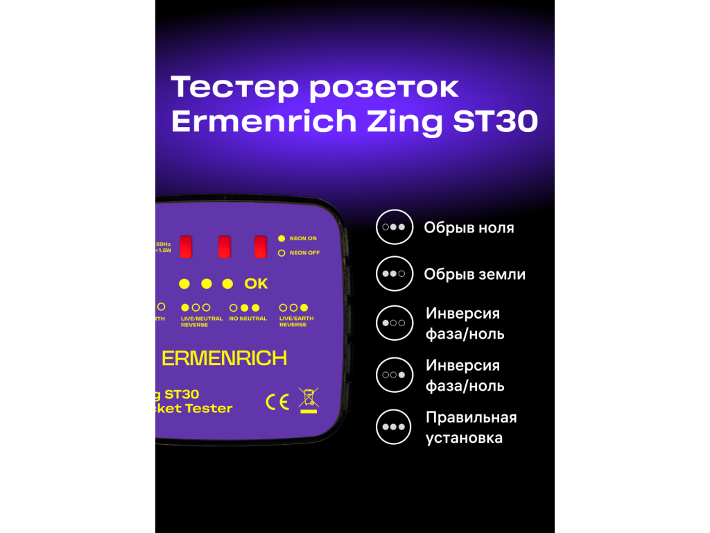 Tester zásuvek Ermenrich Zing ST30 je určen k testování, zda jsou všechny zásuvky správně zapojeny, a ke kontrole napětí. Tester je třeba zapojit přímo do zásuvky a blikání LED kontrolek indikuje různé elektrické závady: chybějící zemnící vodič / chybějící nulový vodič, obrácená polarita fázového a nulového vodiče nebo obrácená polarita fázového a zemnícího vodiče. Kromě toho specifický barevný kód, který se zobrazí na displeji testeru, signalizuje správný stav zapojení. Funkce každého kódu je napsána na přístroji.