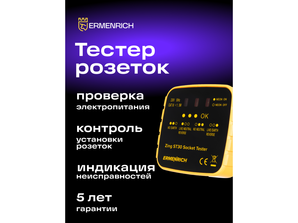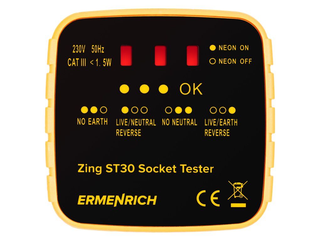Tester zásuvek Ermenrich Zing ST30 je určen k testování, zda jsou všechny zásuvky správně zapojeny, a ke kontrole napětí. Tester je třeba zapojit přímo do zásuvky a blikání LED kontrolek indikuje různé elektrické závady: chybějící zemnící vodič / chybějící nulový vodič, obrácená polarita fázového a nulového vodiče nebo obrácená polarita fázového a zemnícího vodiče. Kromě toho specifický barevný kód, který se zobrazí na displeji testeru, signalizuje správný stav zapojení. Funkce každého kódu je napsána na přístroji.