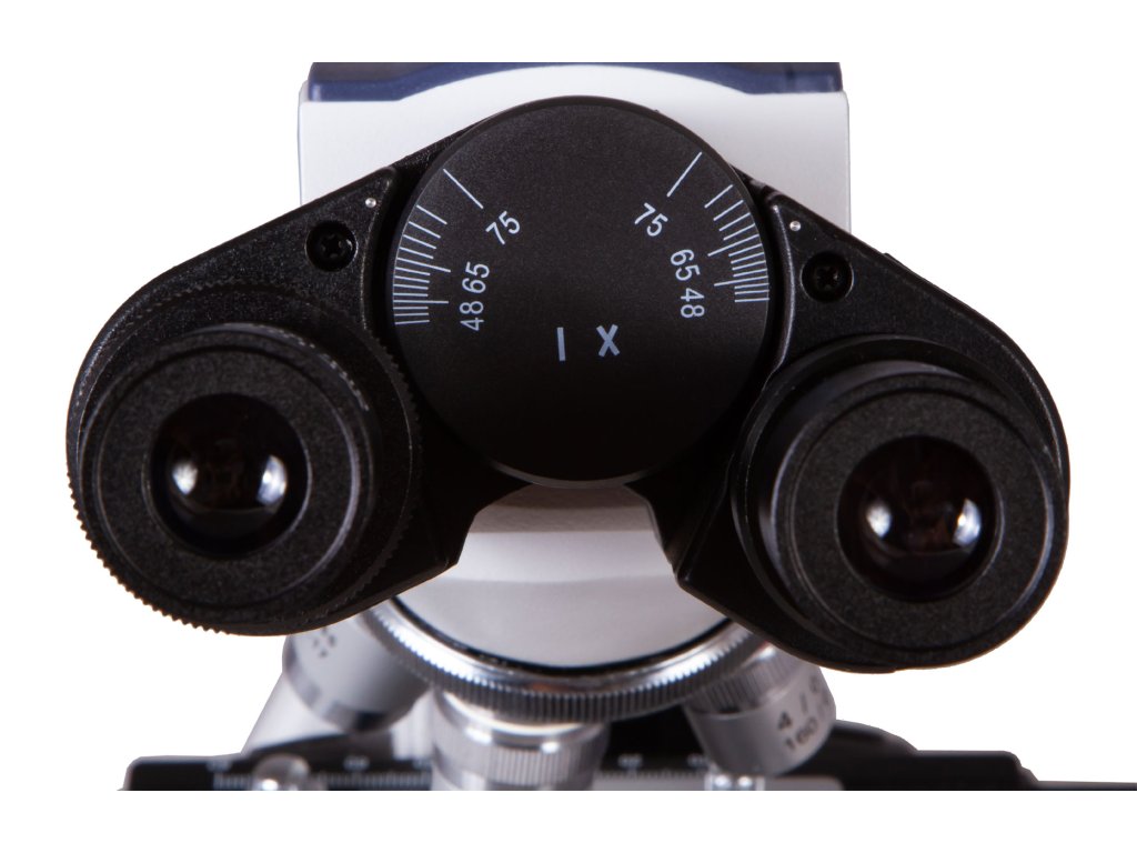 Trinokulární hlava zahrnuje binokulární mřížkový bod a tubus pro instalaci digitálního fotoaparátu (digitální fotoaparát/kameru lze zakoupit samostatně). Vizuální část je nakloněná o 30°, což zajišťuje komfort při dlouhých pozorováních. Trinokulární hlavou lze otáčet o 360°. V mikroskopu jsou instalovány čtyři achromatické objektivy s různým zvětšením; 40x a 100x objektivy jsou vybaveny ochrannými pružinovými rámečky. Kromě toho 100x objektiv lze použít pro pozorování ponořením čočky objektivu do oleje (lahvička s imerzním olejem je součástí dodávky). Širokoúhlé okuláry mají dioptrickou korekci a poskytují dobrou viditelnost. Všechny optické prvky jsou chráněny protiplísňovým povlakem.