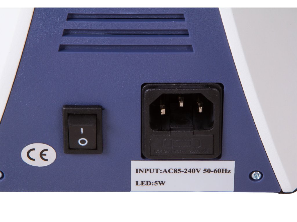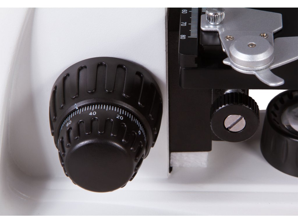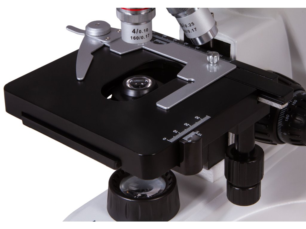 Dvouvrstvým stolkem lze pohybovat ve dvou osách. Vzorky se umísťují pod objektiv mikroskopu a lze je přemisťovat pomocí mechanického měřítka. K dispozici je hrubé a jemné zaostřování. Systém osvětlení mikroskopu se skládá z 5wattového LED světla s nastavitelným jasem a Abbe kondenzoru s irisovou clonou a držákem filtru. Světlo je umístěno pod stolkem a umožňuje provádět pozorování metodou jasného zorného pole v procházejícím světle. Osvětlení je napájeno ze zdroje střídavého napětí.