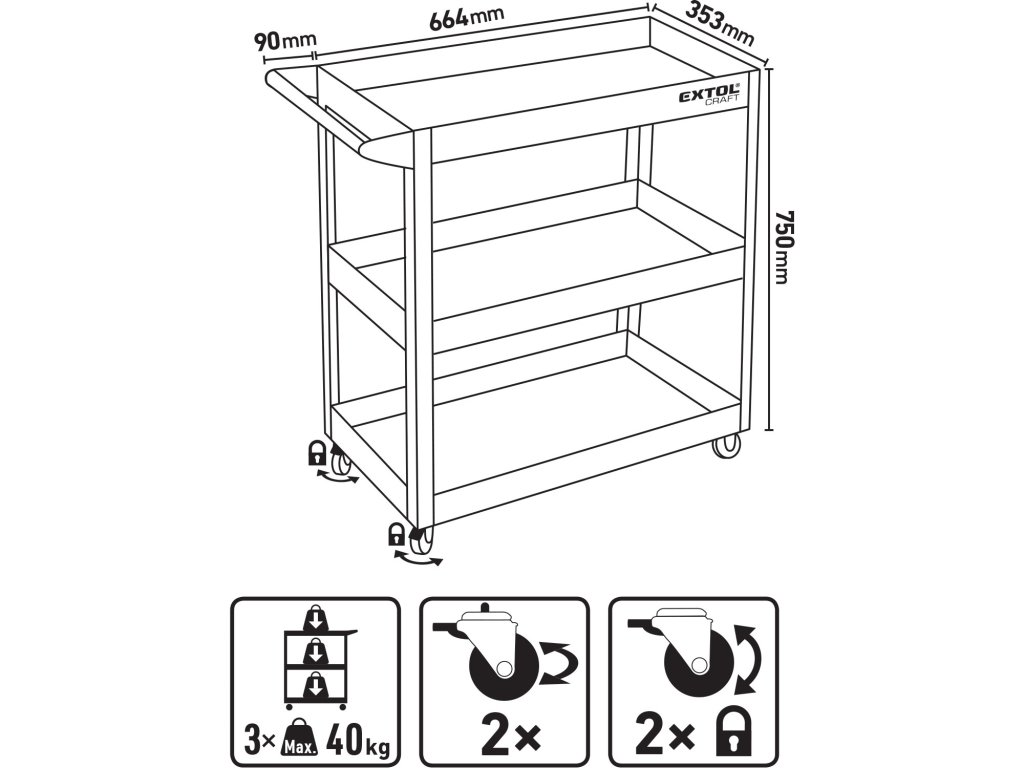 | doplňující parametr: | rozměry bez madla (d/š/v) 700x360x770mm (madlo-7cm), celková max. nosnost 120kg (40kg/police), 2 otočná kolečka s brzdou a dvě fixní kolečka s PVC obručí o průměru 70mm, hmotnost vozíku 10,5kg |