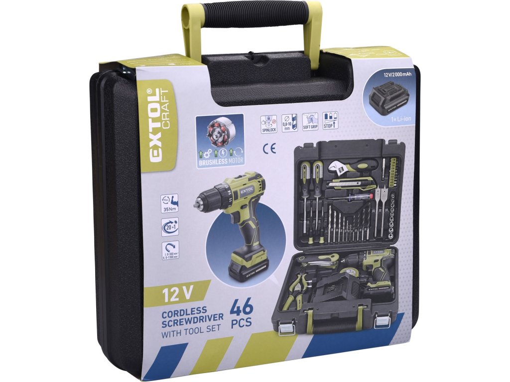 vrtací šroubovák aku, BRUSHLESS, 12V Li-ion s nářadím, sada 46ks