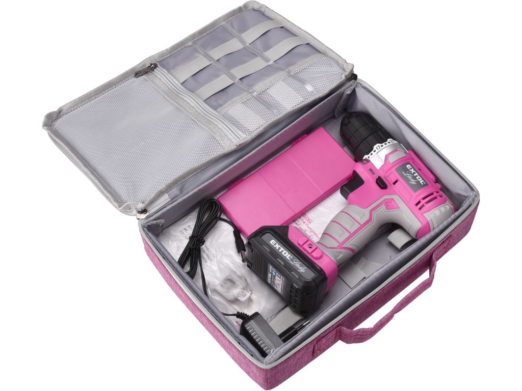 vrtací šroubovák aku, růžový, 12V Li-ion, 1300mAh, v tašce