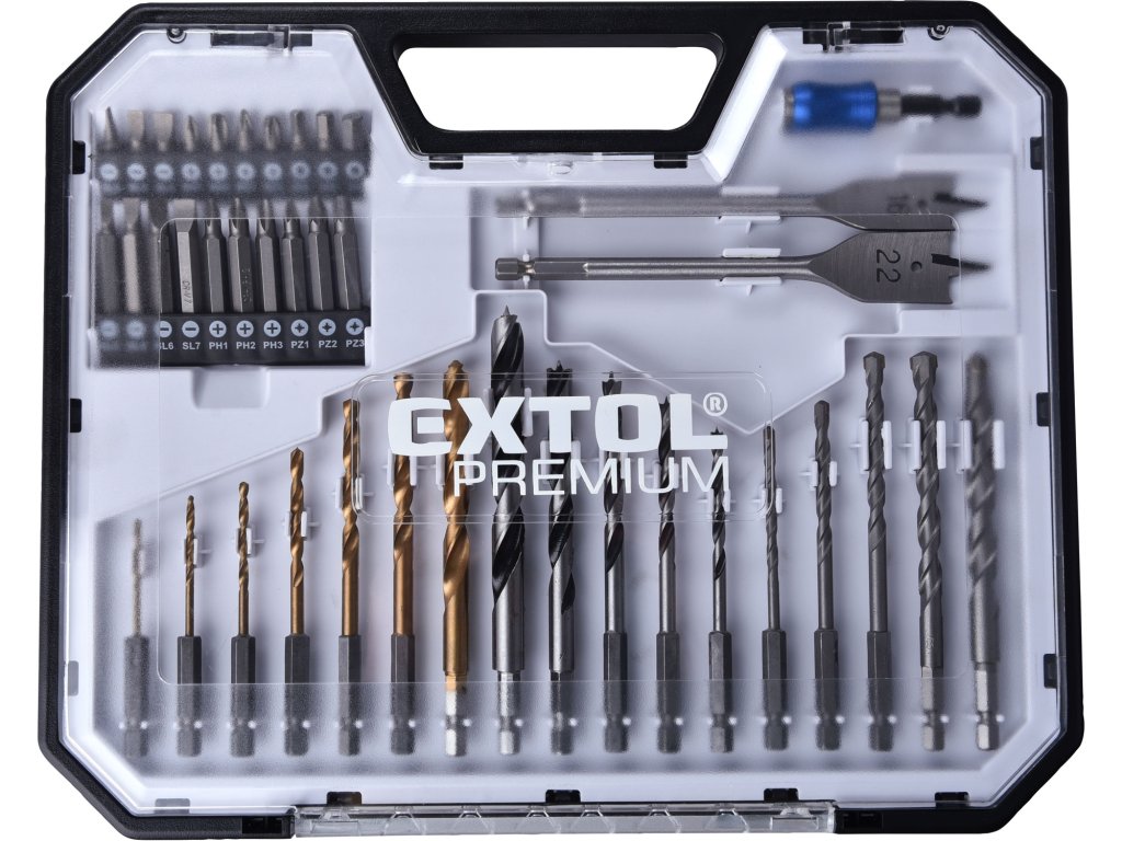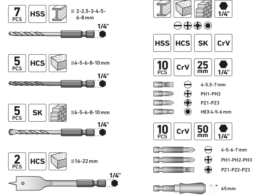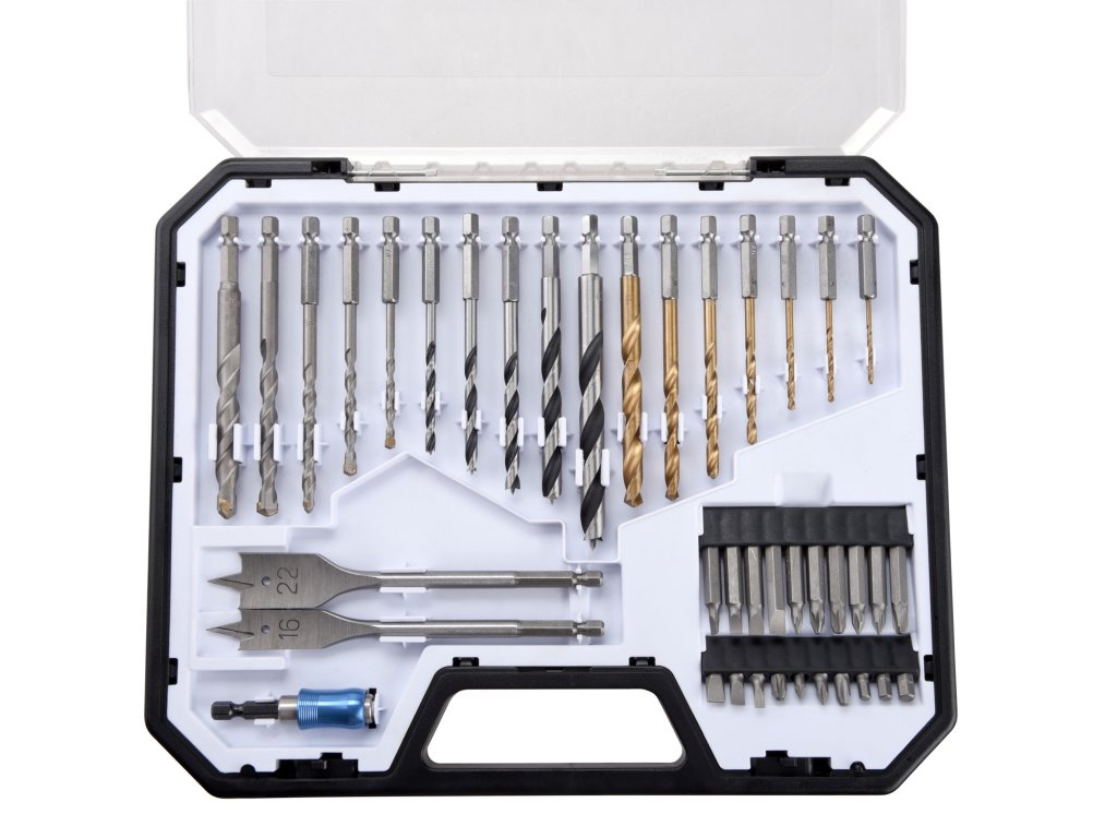 | doplňující parametr: | vrtáky do kovu: O 2-2,5-3-4-5-6-8mm, vrtáky do dřeva: O 4-5-6-8-10mm, vrtáky ploché do dřeva: 16-22mm, vrtáky do zdiva: O 4-5-6-8-10mm, hroty 1/4"x 25mm (-)4-5,5-7mm, PH1-3, PZ1-3, HEX4-5-6mm, hroty 1/4"x50mm (-)4-5-6-7mm, PH1-2-3, PZ1-2-3, držák hrotů |