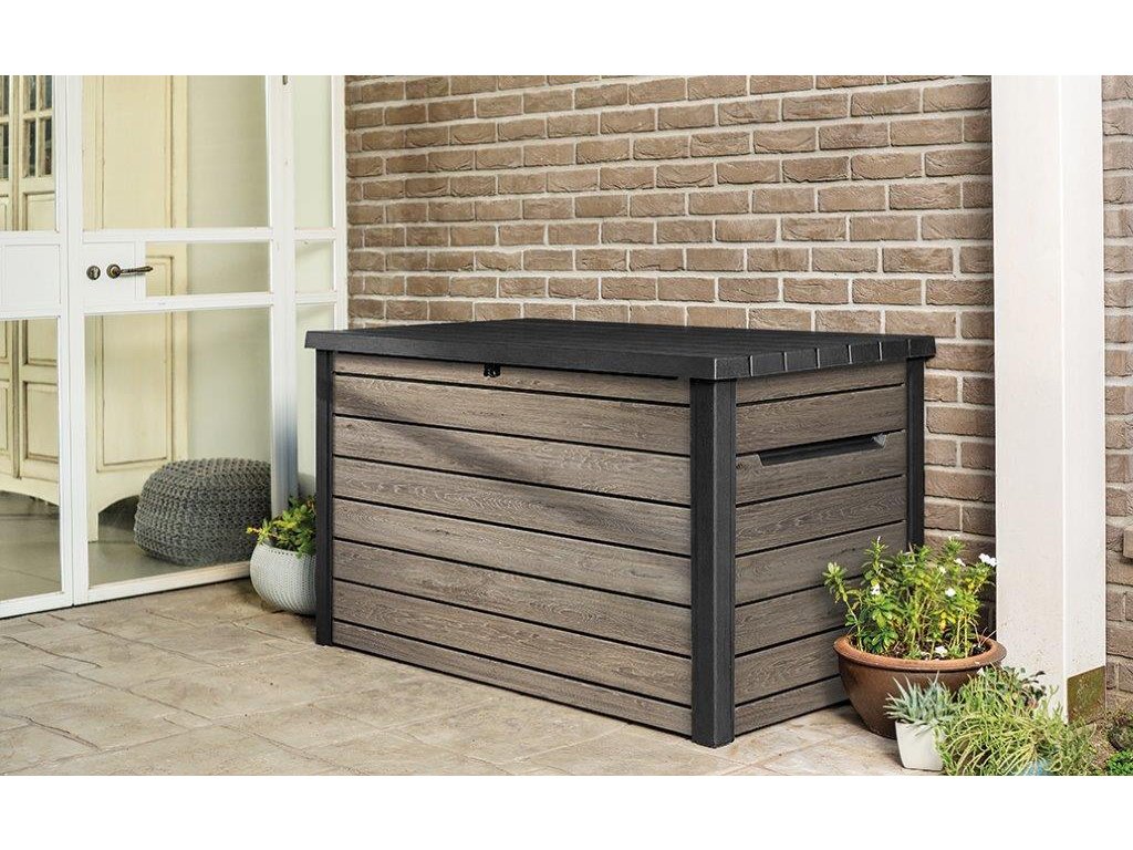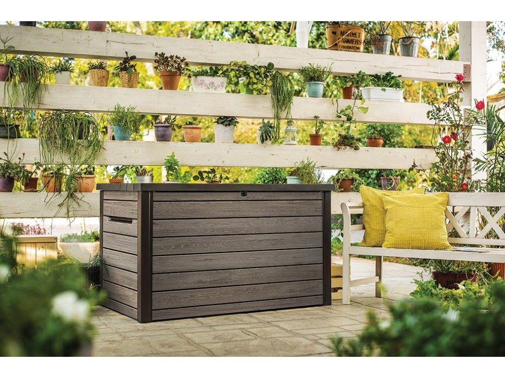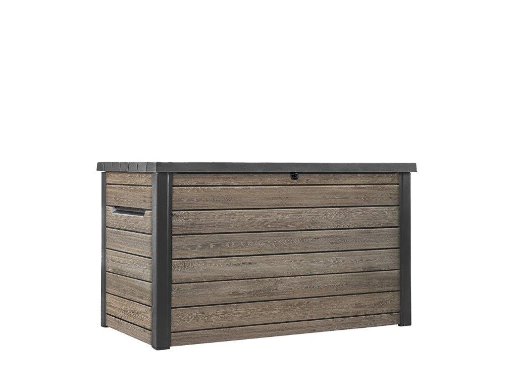 Najděte pro box ideální místo. Díky struktuře, která připomíná dřevo, zapadne téměř do každého prostředí. Abyste uložené předměty uchovali v bezpečí, dá se box uzamknout pomocí visacího zámku (není součástí balení). Hydraulický pístový systém zajistí plynulé a bezpečné zavírání a otevírání víka. Po zavření se na něj navíc usadí až 2 lidi.