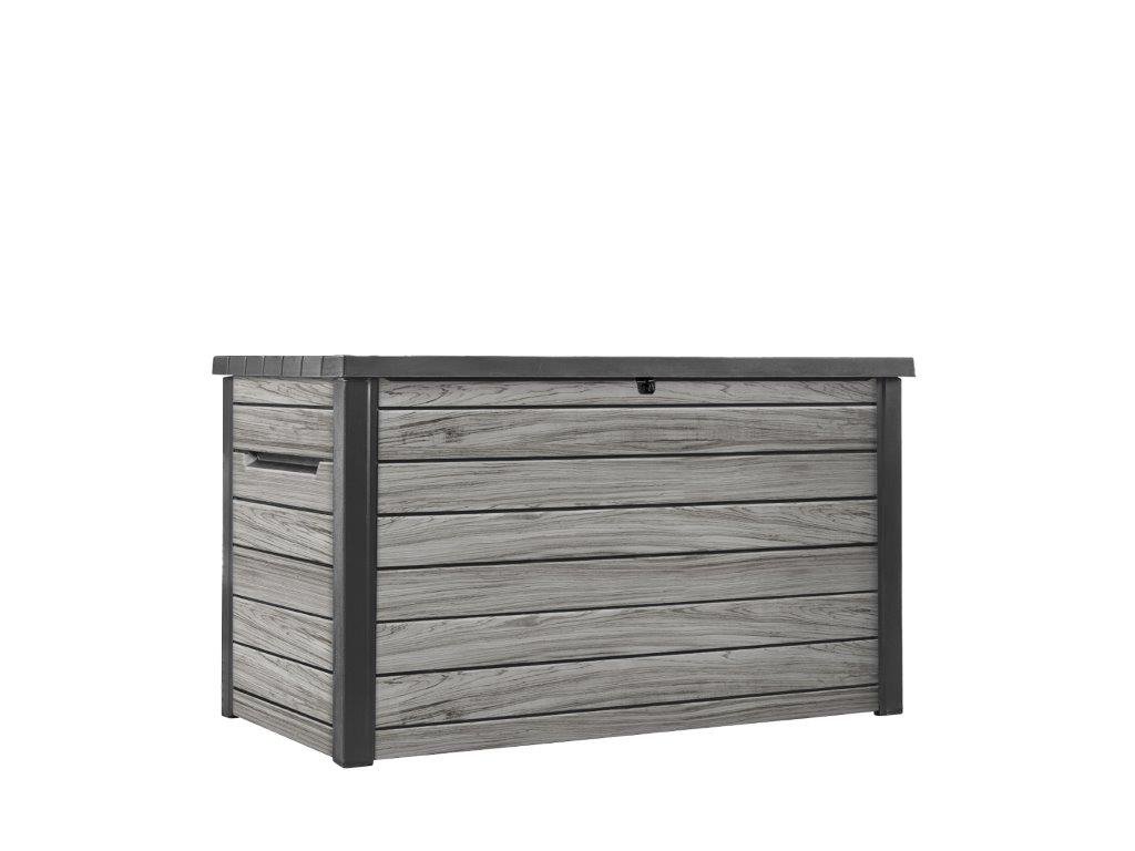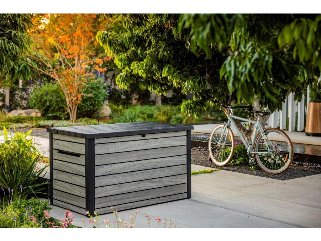 Najděte pro box ideální místo. Díky struktuře, která připomíná dřevo, zapadne téměř do každého prostředí. Abyste uložené předměty uchovali v bezpečí, dá se box uzamknout pomocí visacího zámku (není součástí balení). Hydraulický pístový systém zajistí plynulé a bezpečné zavírání a otevírání víka. Po zavření se na něj navíc usadí až 2 lidi.