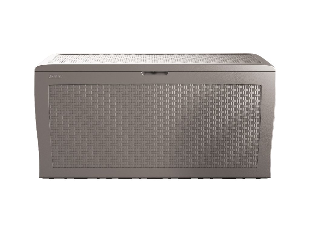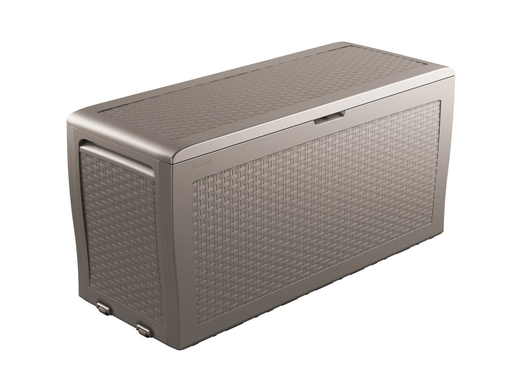 Zahradní box je vyrobený z vysoce kvalitní polypropylenové pryskyřice v moderním designu, který imituje strukturu přírodního ratanu. Skříň je nízká a její dno zvládne unést až 30 kg nákladu a víko vydrží zatížení až 150 kg, takže je ideální i pro skladování podstatně težších věcí. Stěny jsou vyztužené žebrovými segmenty, takže skříň hravě odolá i drsnému zacházení a vandalismu a nevadí ji ani extrémní počasí či UV záření.