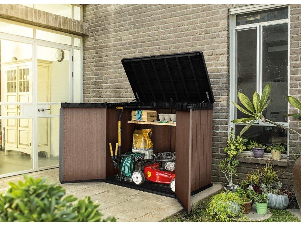Najděte pro box ideální místo na zahradě. Díky struktuře, která připomíná dřevo, zapadne do každého prostředí. Uložené věci navíc můžete uzamknout uvnitř boxu pomocí visacího zámku (není součástí balení). Navíc je vybavený zabudovanou ventilací, která chrání věci před vlhkostí.