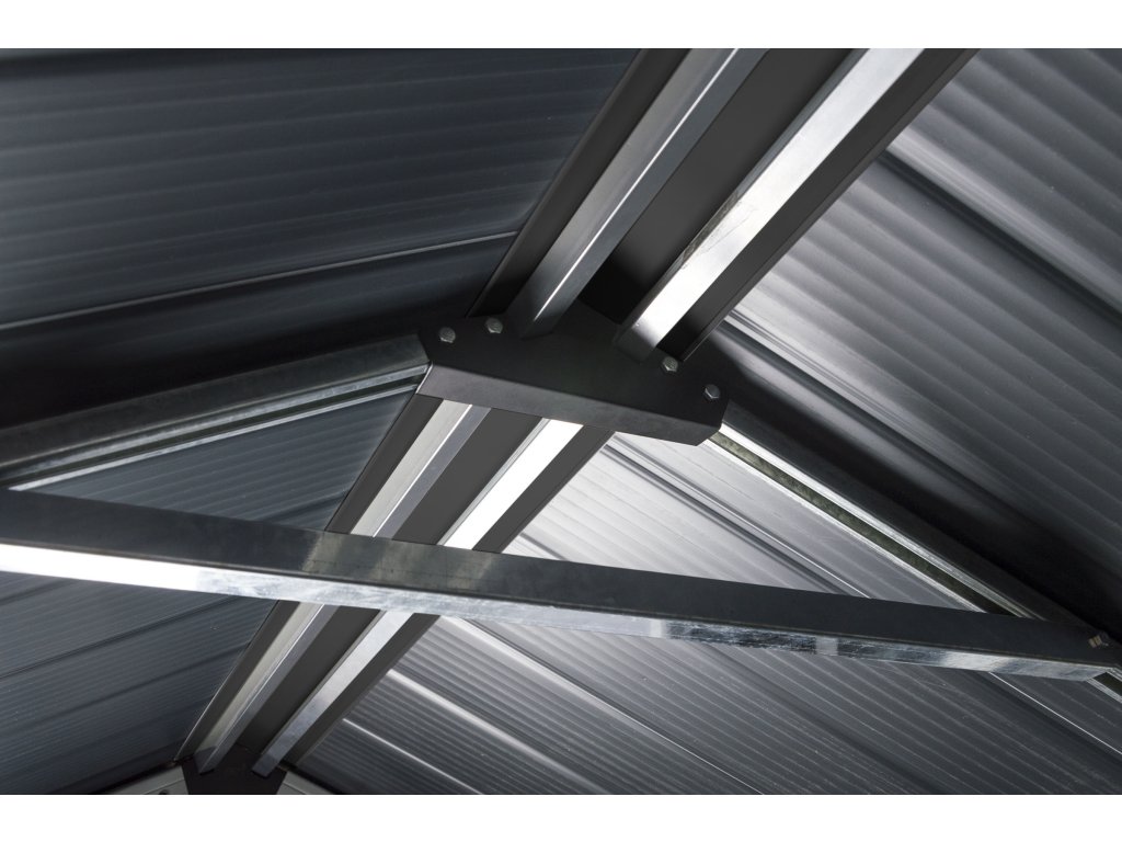 Konstrukce zahradního domku G21 se skládá z pozinkovaného plechu, plastových sloupků o síle materiálu 1,5 mm a vnějších panelů o síle 12 mm. Panely jsou vyrobeny ze sendvičového tvrzeného plastu. Střecha zahradního domku je zkonstruována tak, aby vydržela zatížení až 60 kg/m2. Na přední straně domku jsou umístěny dvoukřídlé dveře o šířce 151 cm a výšce 183 cm, které zajišťují snadný přístup.