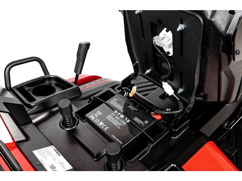 - Komfort obsluhy posouvá na vyšší úroveň premium sedadlo s opěrkami, multifunkční displej, LED osvětlení s denním svícením a senzorem soumraku či podsvícené logo. Praktické jsou také držáky na nápoje, přední nárazník a standardní tažné zařízení.